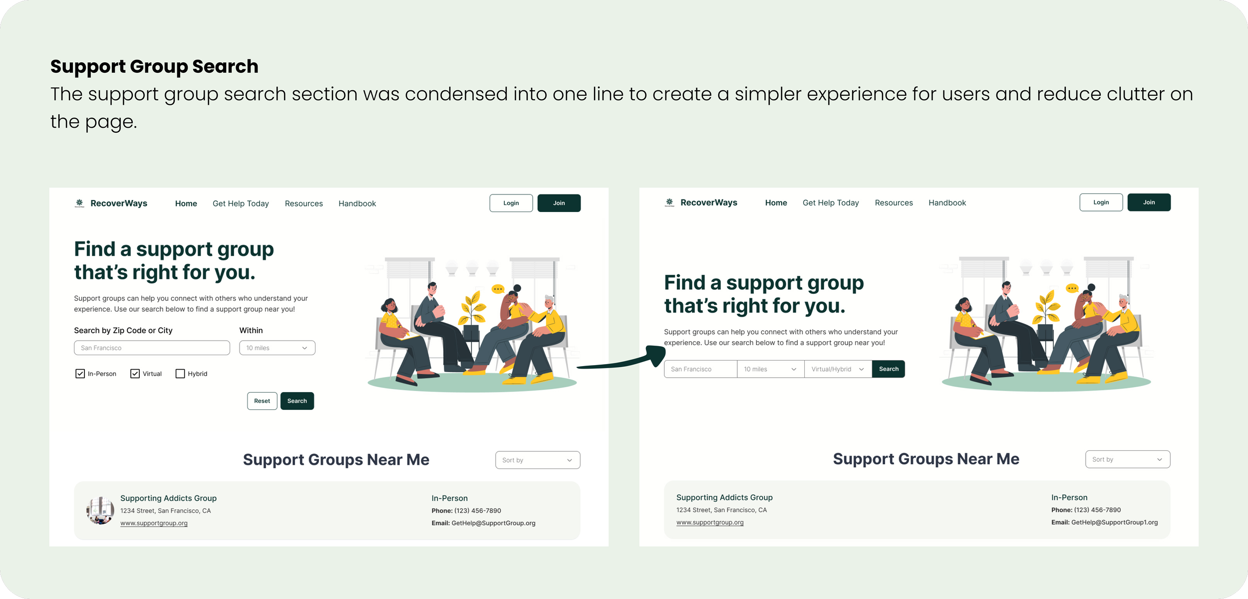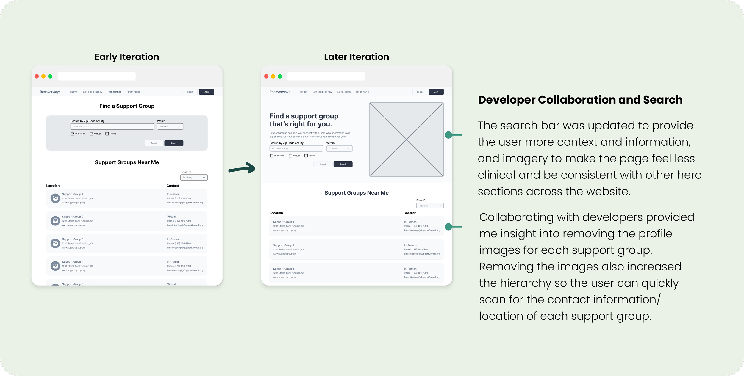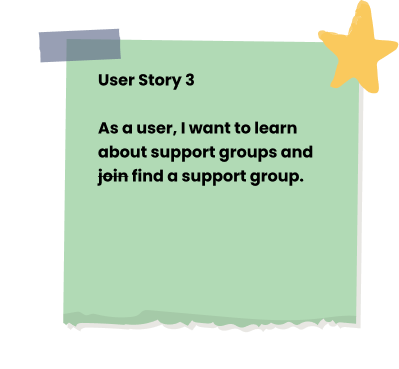 The original user story I led was for a user to join a support group. When I met with the client for clarification on what types of support groups are offered, I found out that the intention was for it to be a support group search feature. By collaborating early on with the client, I was able to adjust the user story proactively to reflect a search feature rather than a signup feature.