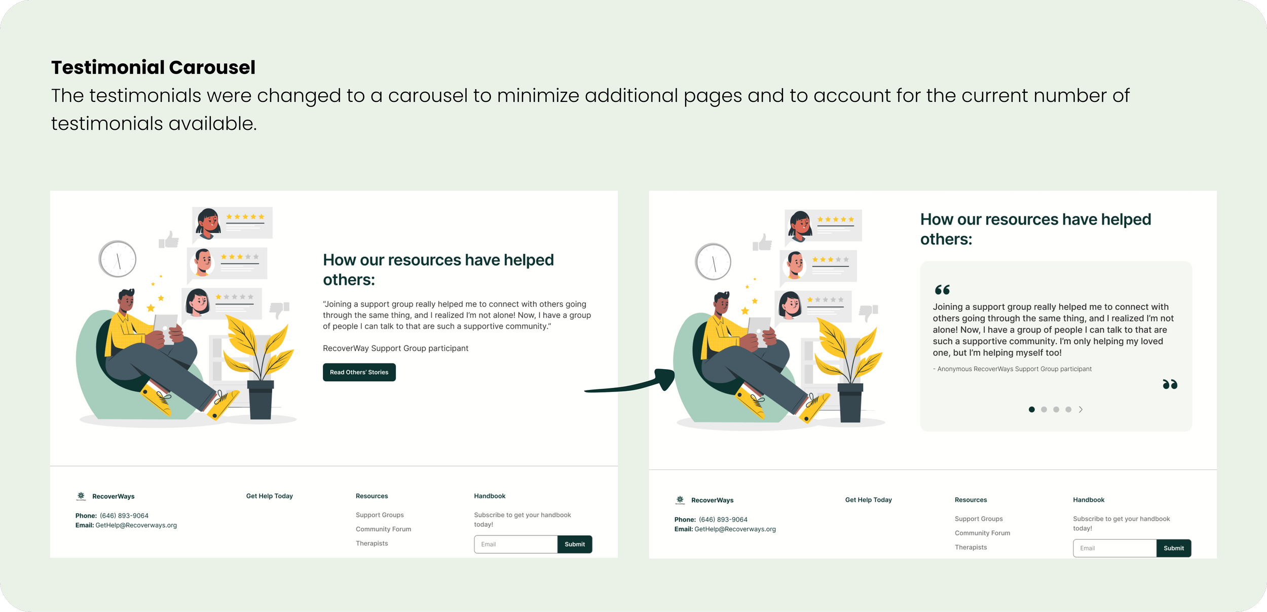 At the start of this project, RecoverWays didn’t have an existing design system, creating a challenge of being consistent across the platform and slowed down the design process initially . As I began to build a design system, I also saw our team’s communication and consistency increase, and our decision-making became more efficient. With the design system in place, we were able to resolve consistency issues and focus more energy on other aspects of the design that would have a deeper impact!