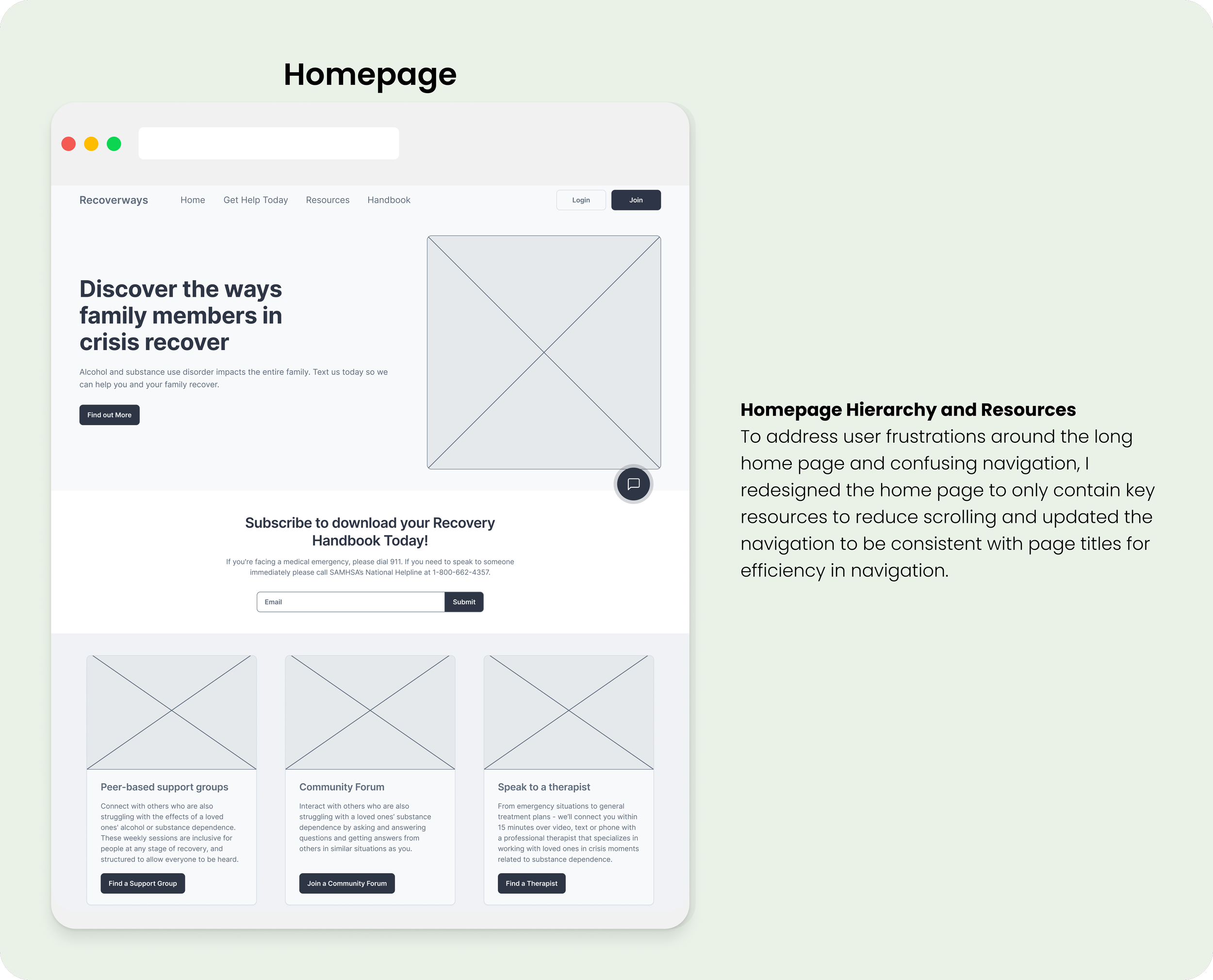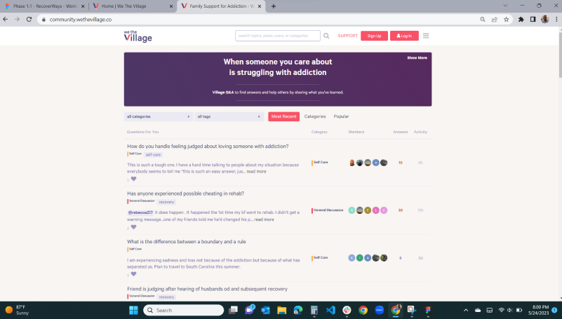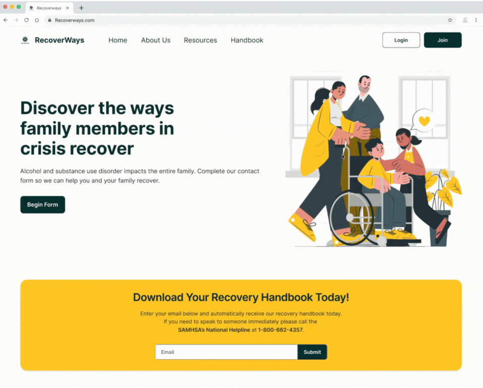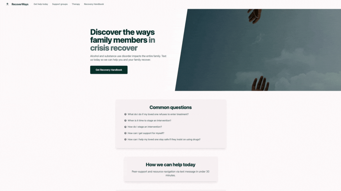 RecoverWays current platform requires users to navigate to multiple pages or scroll to find the help they need. Also, the current homepage has listed unavailable resources and does not have user-friendly navigation for crisis triage. Users reported feeling frustrated by the lack of resources and wanted to be able to quickly get help without having to provide extensive personal information.