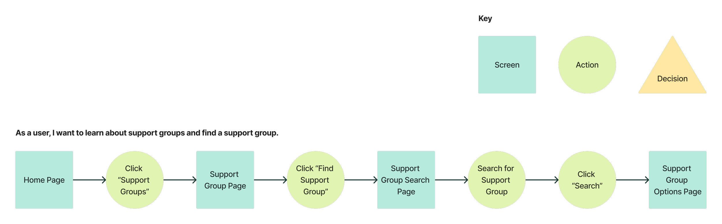 Since I was delegated to design the support group feature, I mapped out the user flow to help me visualize steps a user might take to complete the task of finding a support group. The change of the support group page being a search feature from earlier client discussions was reflected in this flow and helped me identify interactions and interfaces to focus on going into sketching and wireframing.