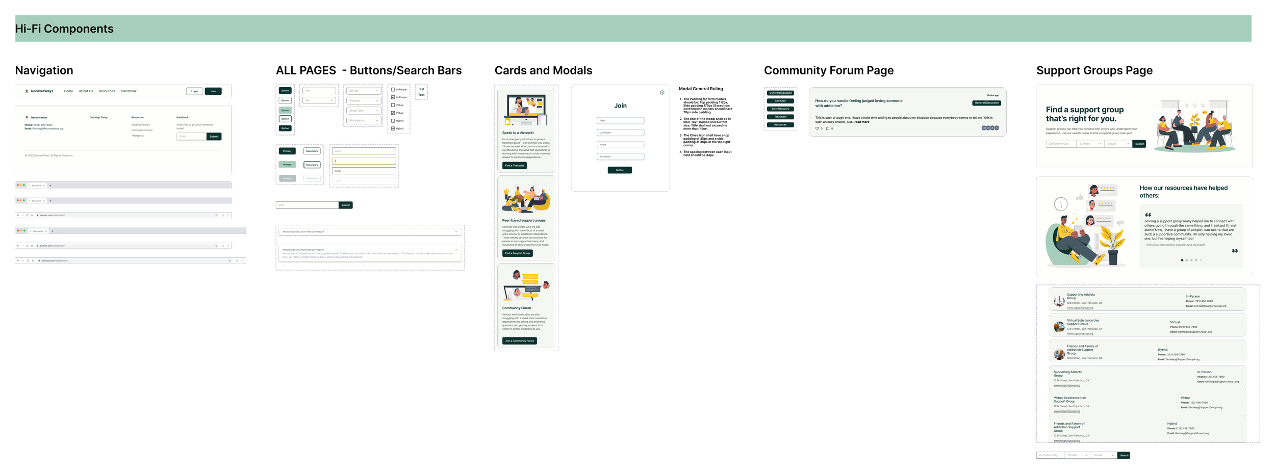 Using the newly updated and reorganized design system, I began to design the final hi-fidelity mockups. Iterating continued to happen during this process, along with regularly checking that our final fonts and colors met color contrast and accessiblity standards so users of all abilities can use RecoverWays.