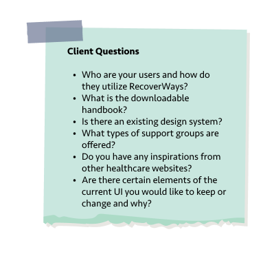 Myself and the team kicked off this project with curiosity and excitement to work on a project that had a deep impact. To better understand RecoverWays and to form a plan for the redesign, I came ready with a sticky note full of questions!