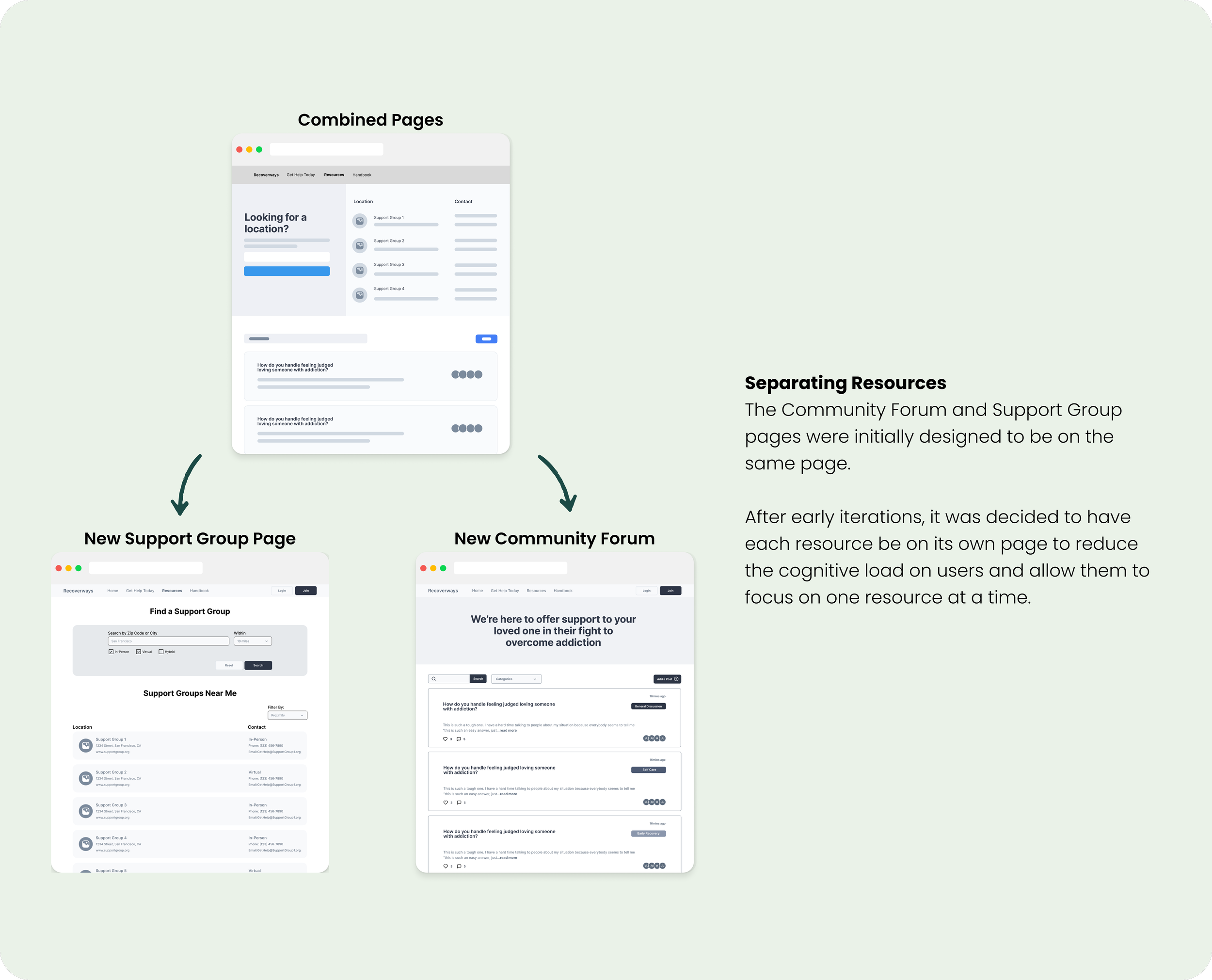 I continued to iterate as I translated my sketches into low and medium-fidelity wireframes and adjusted to team and client feedback along the way to ensure the designs met user and business needs. With each iteration of the resources and support group flows, I focused on creating consistency from screen to screen to reduce cognitive load on users, and enhanced the page hierarchy so essential resources were quickly and easily accessible.